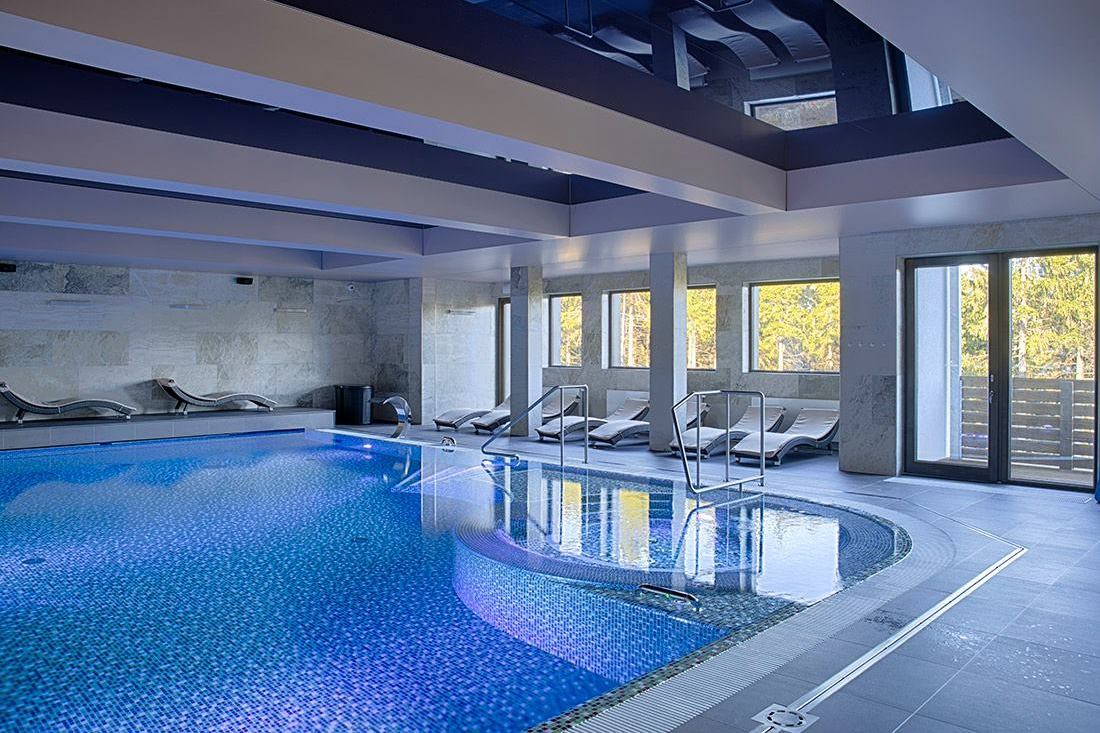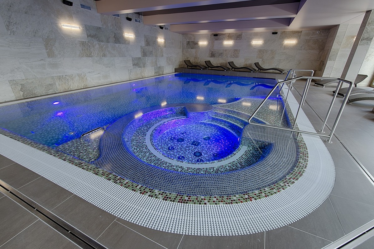 - Krytý vyhrievaný bazén s masážnymi tryskami (12 × 6 m)