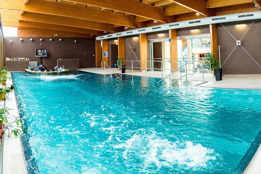 - Vnútorný termálny bazén s minibarom (16×6 m)