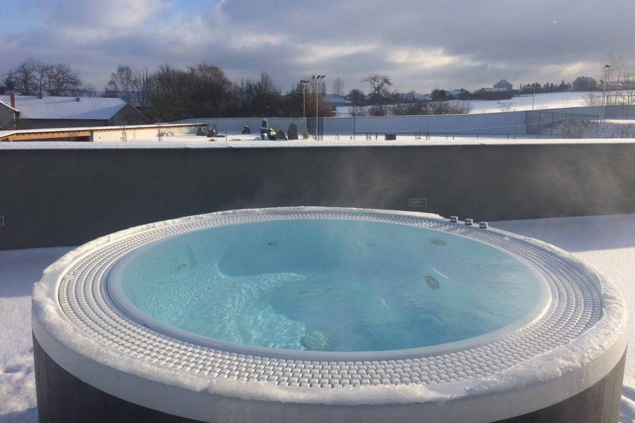 - Krytý bazén s protiprúdom (3,5 × 12 m, teplota 28 °C)